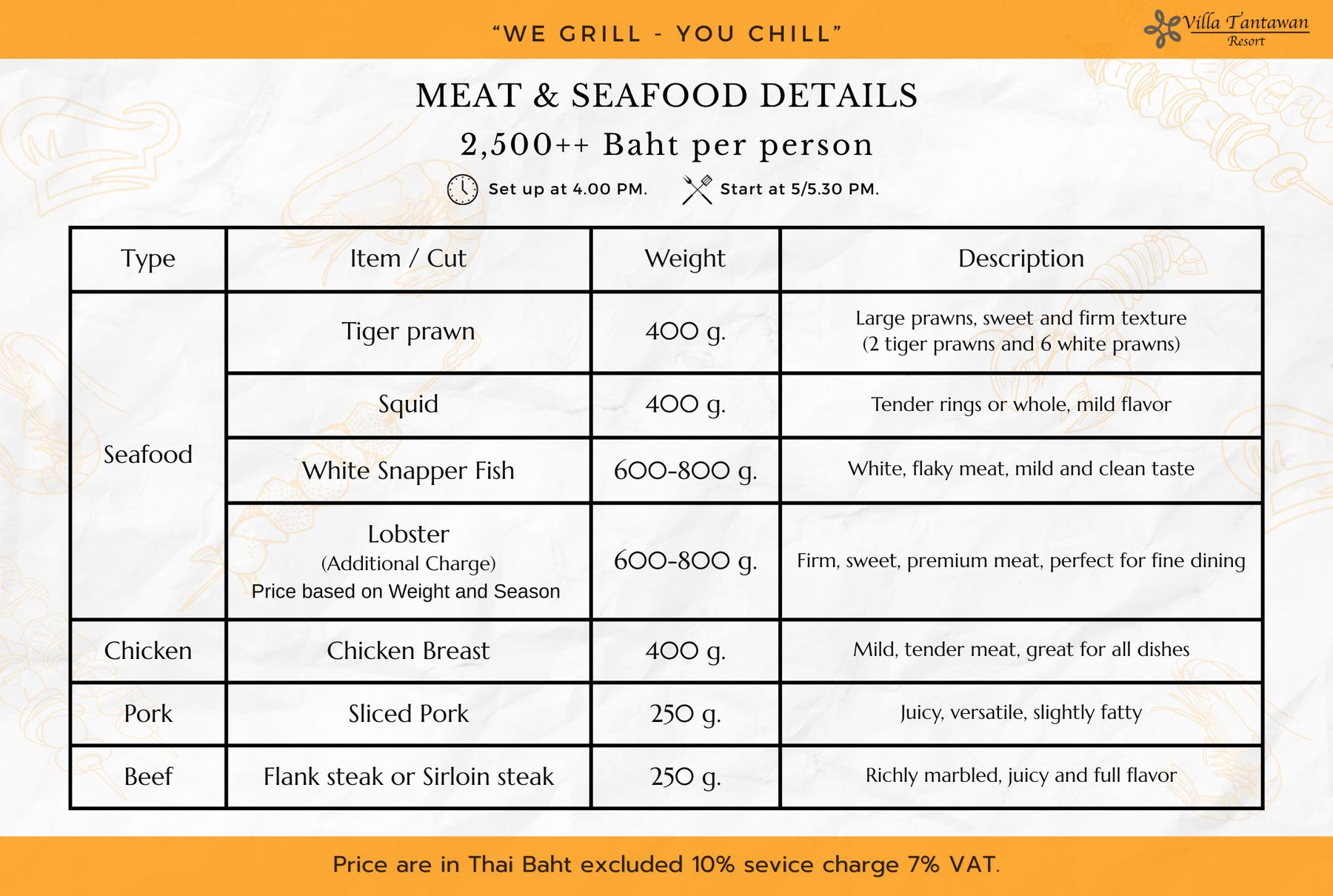 Start to prepare Equipment and Grill in your villa at 16.00 hrs. then Grilling at 17.00-17.30 hrs.